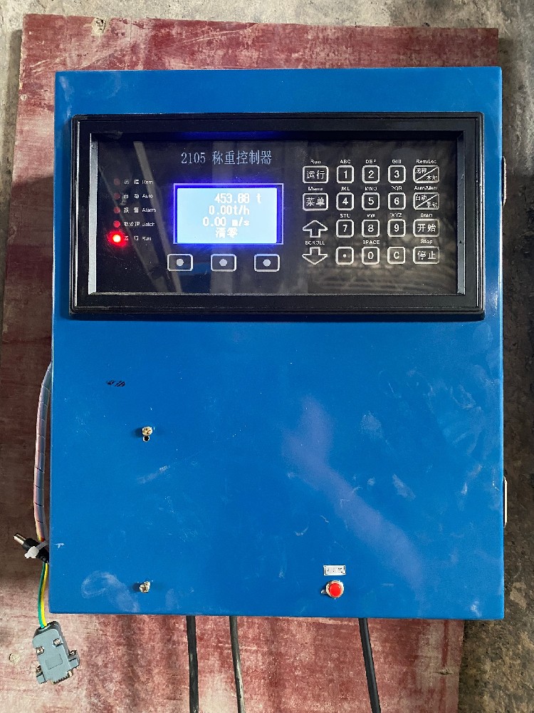 4.实物校准:用地磅称出物料重量,最好2车,然后启动皮带, 按“菜单键”进入“主菜单一”,选择“实物校准”,启动皮带的同时,按“开始”,并且用秒表计量一下皮带运行的时间,当物料从皮带上走完以后,让皮带运行整数圈,按下完成键