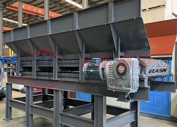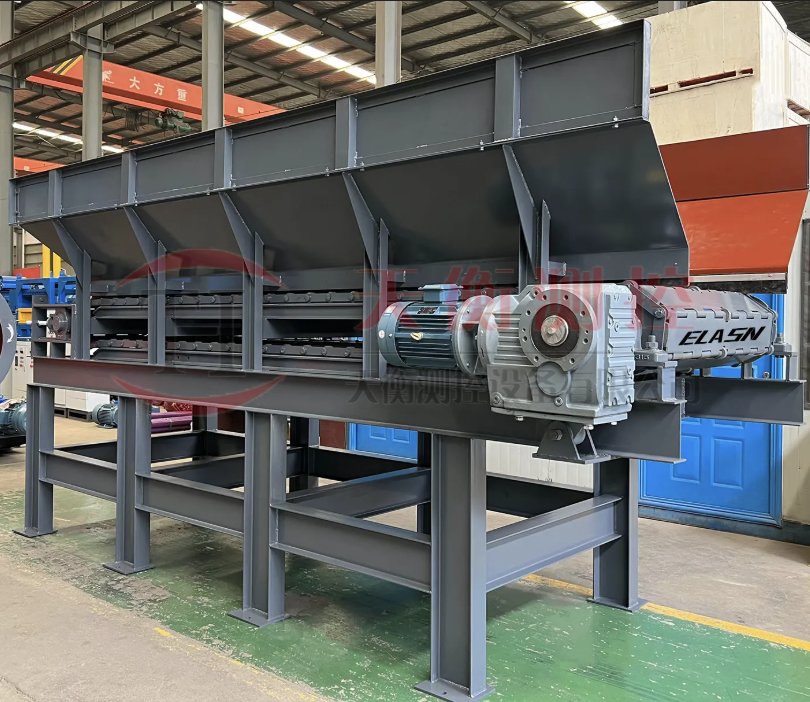 材料通过导槽均匀分布在链板上,然后以均匀速度(0.05-1.5米/秒)移动至出料口。过载传感器实时监测电机扭矩,过载时会触发链板反向运行0.5秒,以同步清除堵塞并报警。模块化链板组可部分更换,全密封结构(IP67)和耐高温设计(120°C)适合高尘埃和腐蚀性工作环境,产能为50-2000吨/小时,准确匹配破碎机进料需求,确保生产线连续高效运行。产品特点:胶带衬链板;耐腐蚀性、高温,而又具有胶带给料机的计量优势。